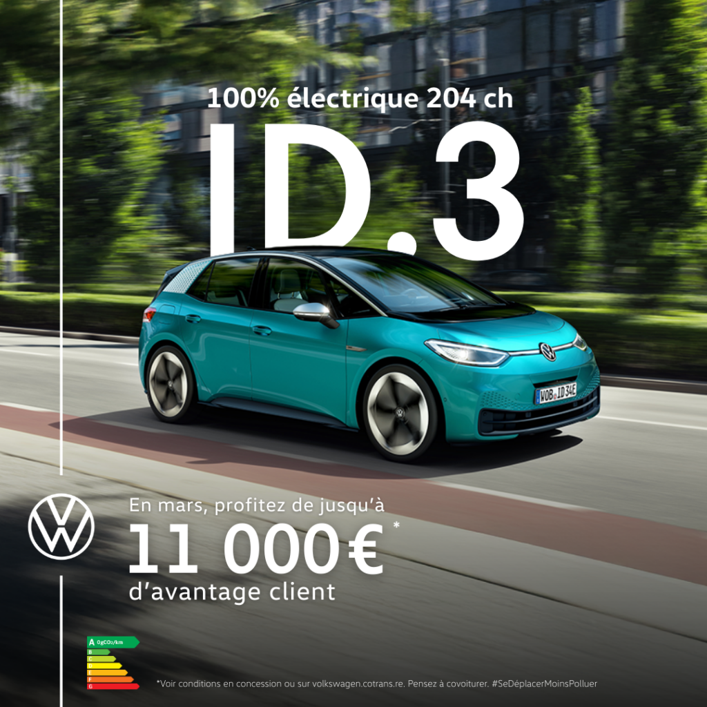 * Profitez de jusqu’à 11 000 € d’avantage client dont 3 000 € de prime « CEE Coup de pouce » Autres ménages, valable pour tout achat d’un véhicule neuf ID.3 Pro Life Max 59 kWh 204 ch avant le 31/03/2026. Offre non cumulable valable jusqu’au 31/03/2026, réservée aux particuliers et dans la limite des stocks disponibles, dans le réseau COTRANS AUTOMOBILES – RCS St Denis 444 285 829 participant. Consommation en cycle mixte (kWh/100km) : 15,3-16,0. Émissions de CO2 (g/km) :0. Visuel non contractuel.