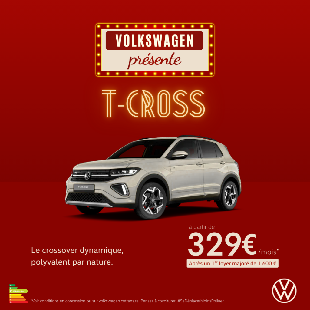 * Exemple pour la location longue durée d’un véhicule neuf T-Cross Life + TSI 95 ch, sur 60 mois et 60 000 km au premier terme échu : 1er loyer majoré de 1 600 € suivi de 59 loyers mensuels de 329 € TTC, hors prestations facultatives, carte grise, peinture métallisée et malus. Engagement de reprise en fin de contrat par le distributeur avec paiement des frais de remise à l’état standard et des km supplémentaires. Coût du kilométrage supplémentaire entre 0 et 10 000 km : 0,11€ TTC/km, au-delà 0,20€ TTC/km. Offre non cumulable valable jusqu’au 31/03/2026, réservée aux particuliers et dans la limite des stocks disponibles, dans le réseau COTRANS AUTOMOBILES – RCS St Denis 444 285 829 participant et sous réserve d’étude et d’acceptation par CREDIT MODERNE OCEAN INDIEN, S.A. au capital de 4.575.776 € – Siège social : 28 rue Lislet Geoffroy – CS 91028 – 97495 Ste Clotilde – RCS St Denis 333 353 944. N°Orias 07029039 (www.orias.fr). Consommation en cycle mixte WLTP (l/100 km) : 5,6-5,7. Émissions de CO2 en cycle mixte WLTP (g/km) : 127-129. Visuel non contractuel.