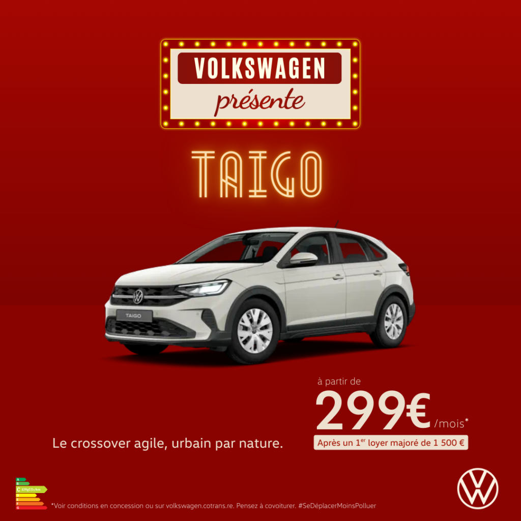 * Exemple pour la location longue durée d’un véhicule neuf Taigo 1.0L TSI 95 ch, sur 60 mois et 60 000 km au premier terme échu : 1er loyer majoré de 1 500 € suivi de 59 loyers mensuels de 299 € TTC, hors prestations facultatives, carte grise, peinture métallisée et malus. Engagement de reprise en fin de contrat par le distributeur avec paiement des frais de remise à l’état standard et des km supplémentaires. Coût du kilométrage supplémentaire entre 0 et 10 000 km : 0,11€ TTC/km, au-delà 0,20€ TTC/km. Offre non cumulable valable jusqu’au 31/03/2026, réservée aux particuliers et dans la limite des stocks disponibles, dans le réseau COTRANS AUTOMOBILES – RCS St Denis 444 285 829 participant et sous réserve d’étude et d’acceptation par CREDIT MODERNE OCEAN INDIEN, S.A. au capital de 4.575.776 € – Siège social : 28 rue Lislet Geoffroy – CS 91028 – 97495 Ste Clotilde – RCS St Denis 333 353 944. N°Orias 07029039 (www.orias.fr). Consommation en cycle mixte WLTP (l/100 km) : 5,4. Émissions de CO2 en cycle mixte WLTP (g/km) : 122. Visuel non contractuel.